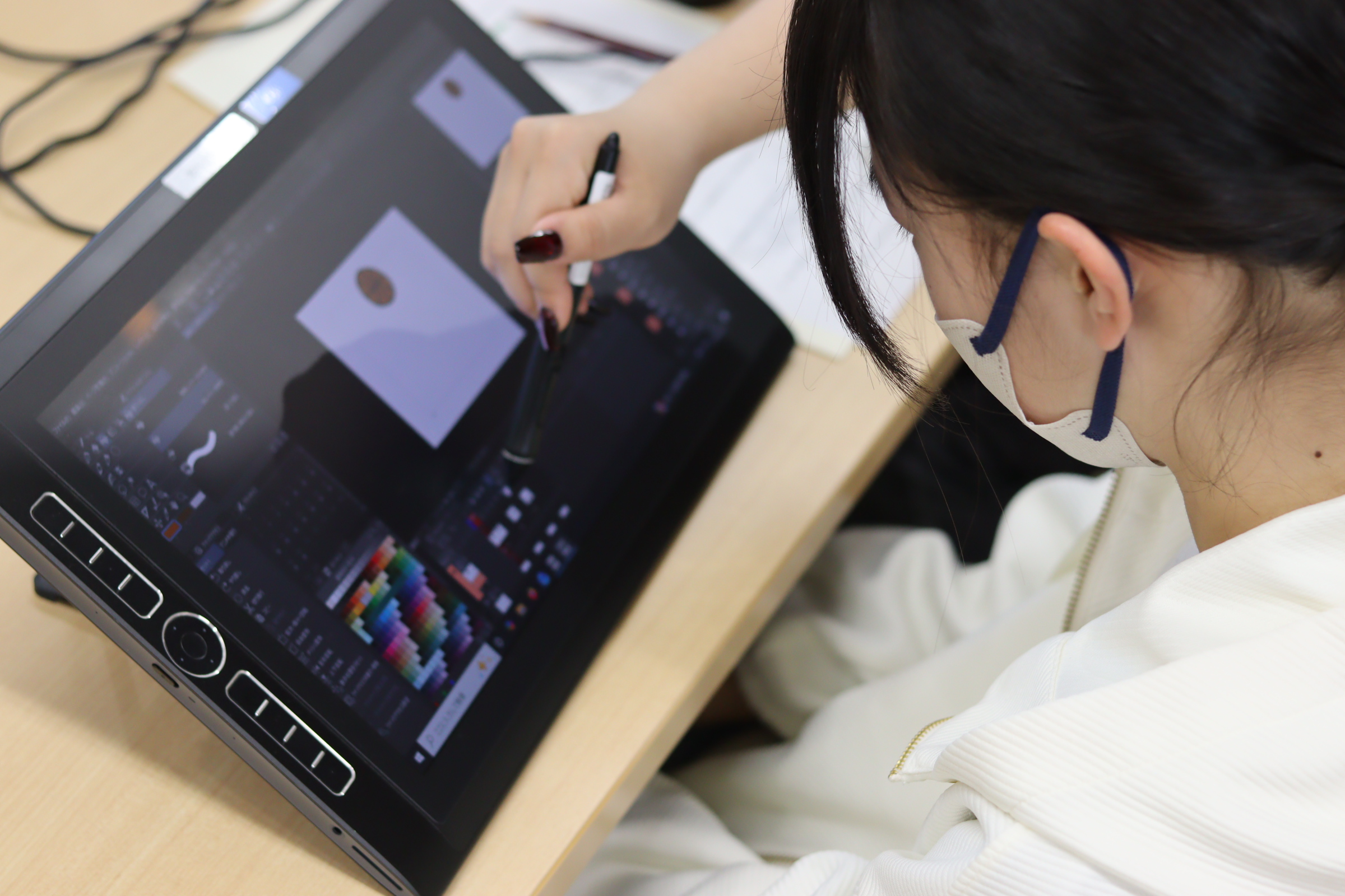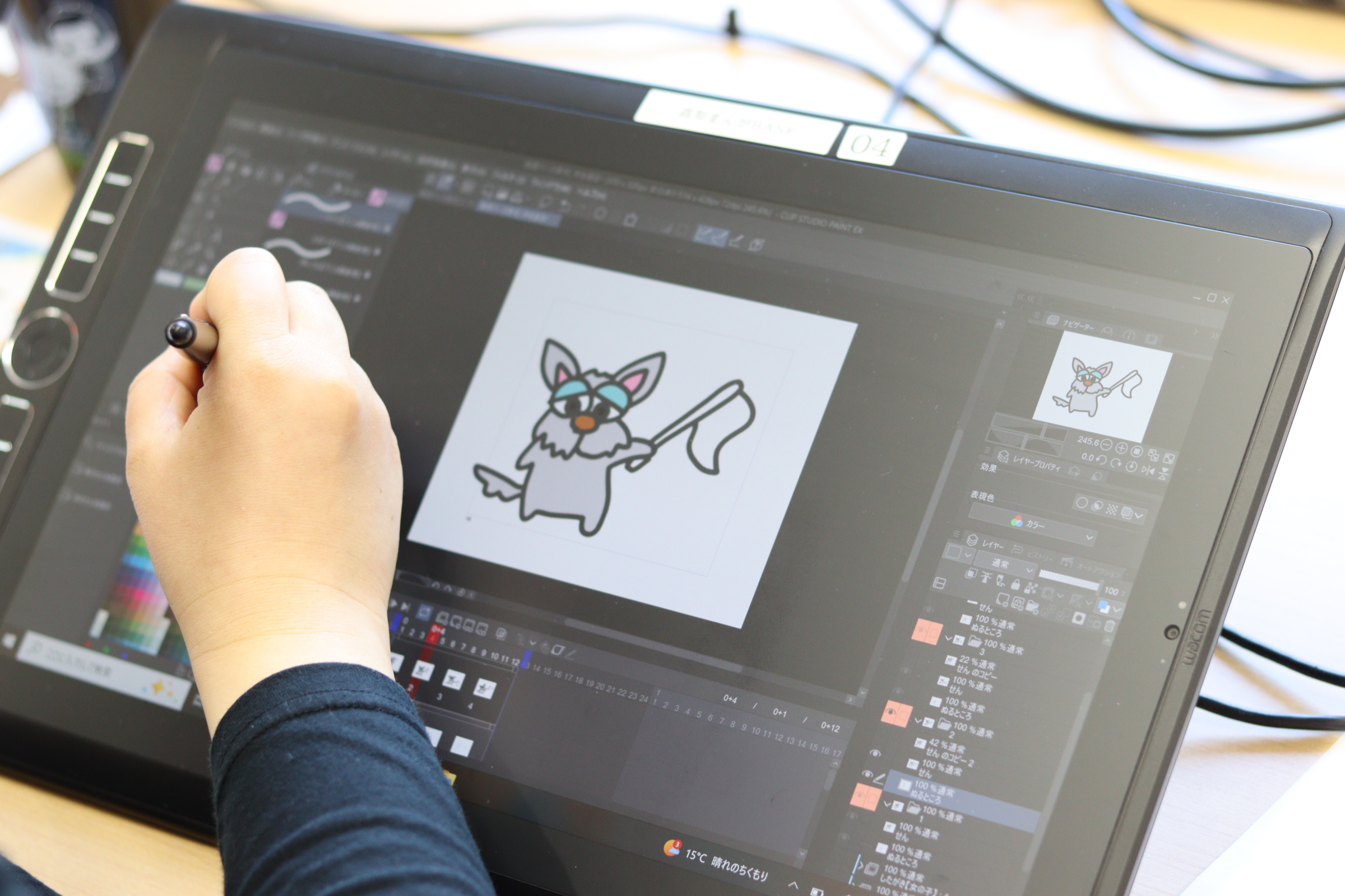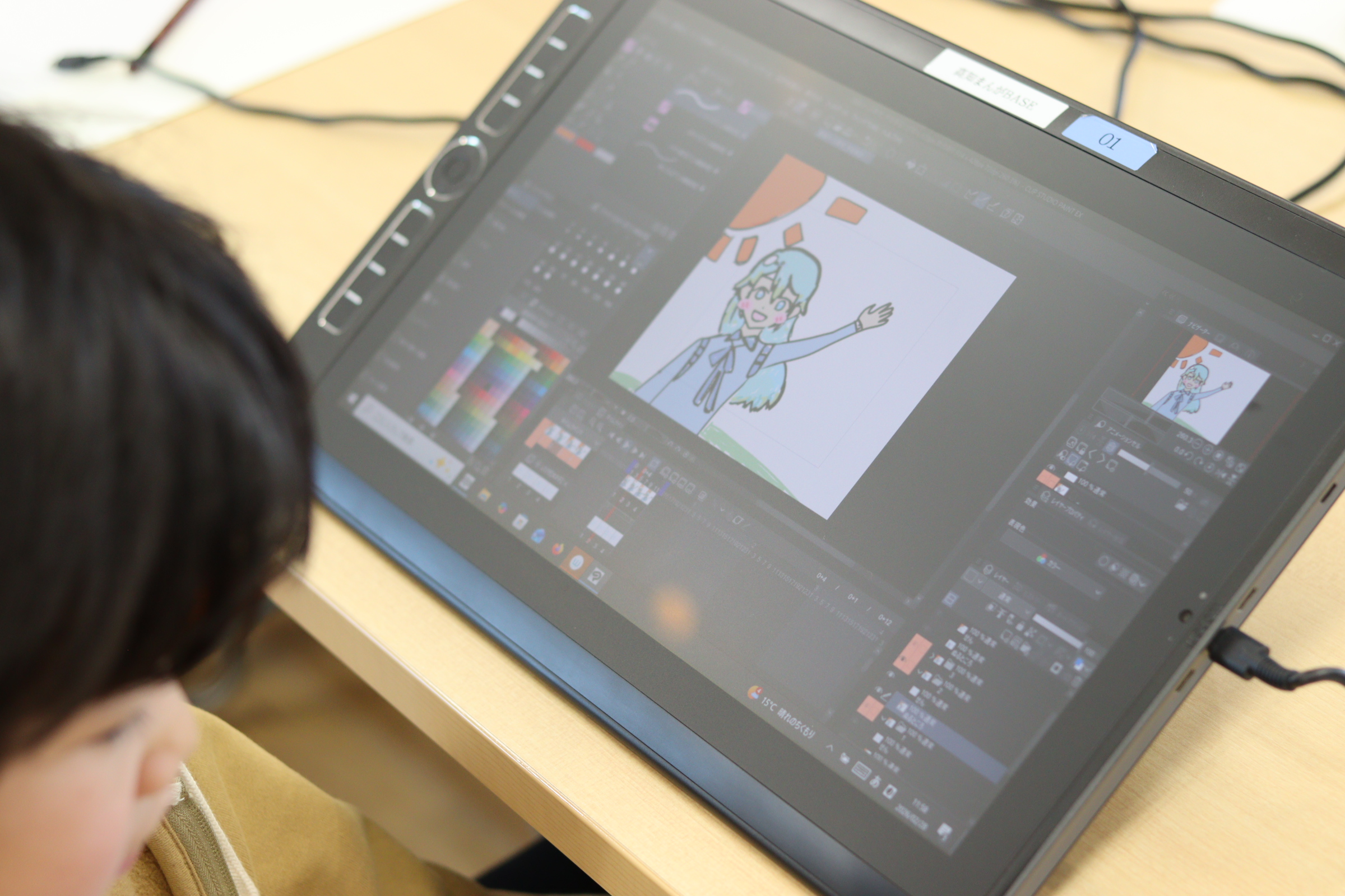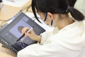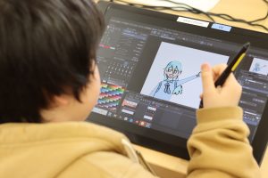 ▲液晶タブレットと作画ソフト「CLIP STUDIO EX」を使用し、現場さながらの環境で作業をします。