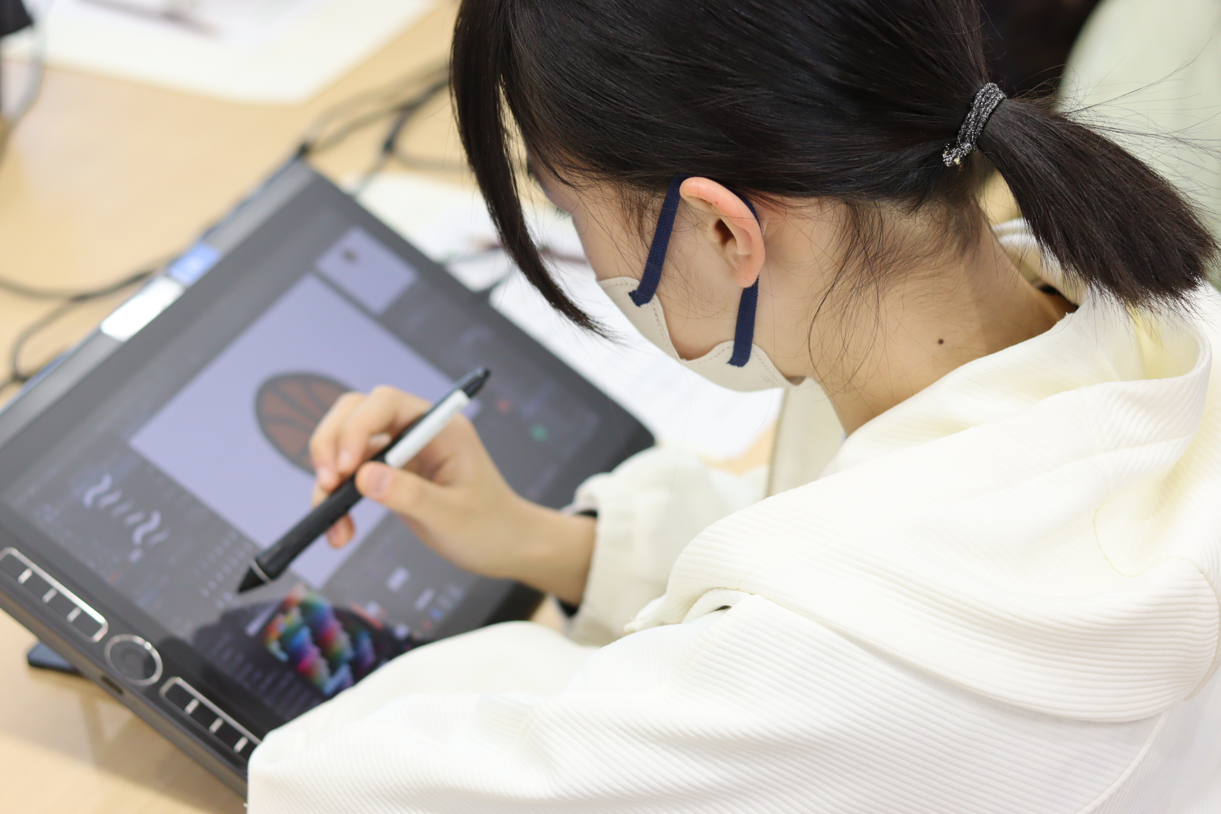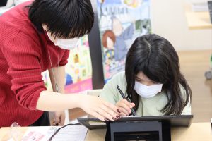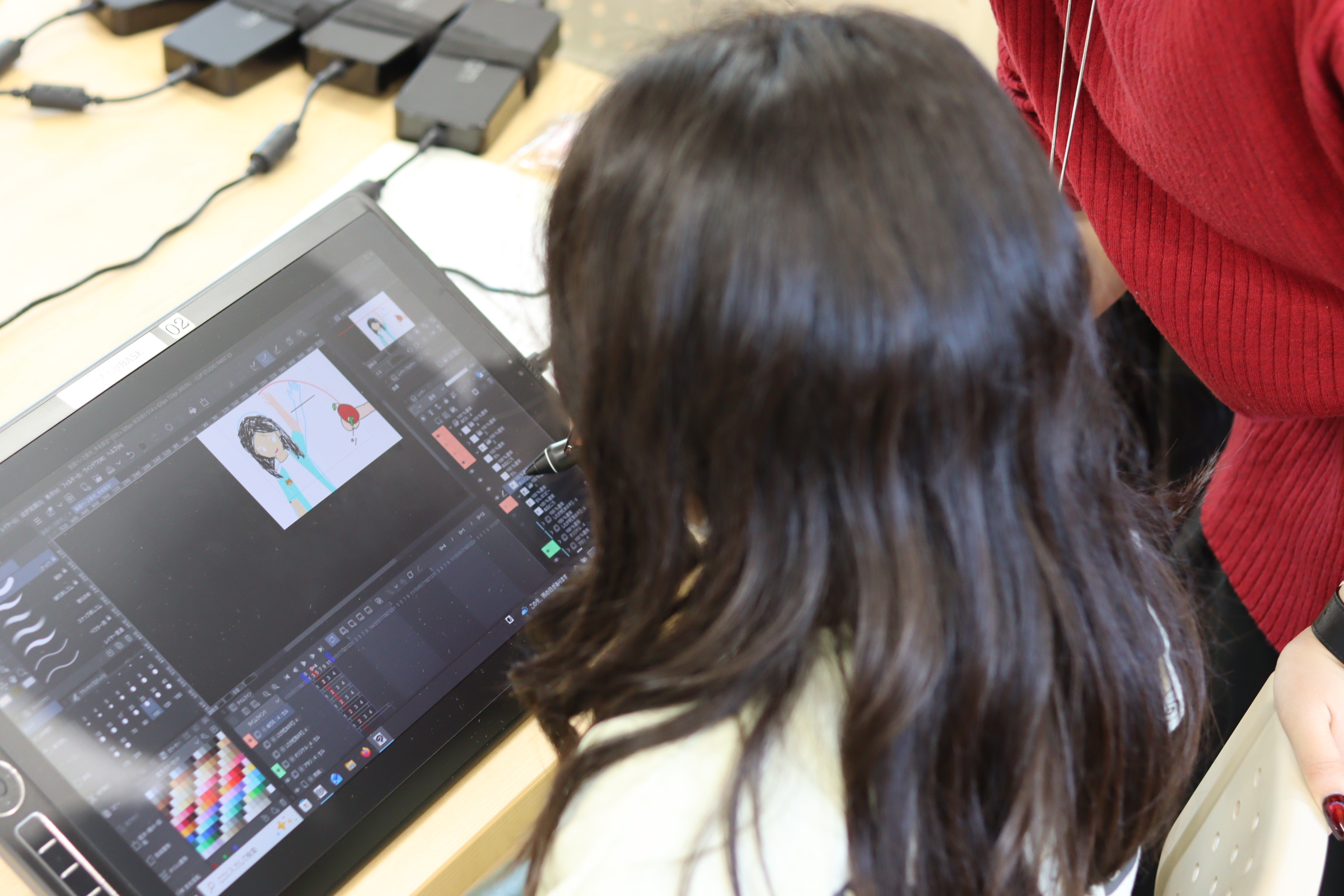 ↑作画が順調に進んでいても、操作の途中で絵が描けなくなったりすることも!本格的なソフトなので使い方に難しいところも出てきます。しかし、講師に直接教えてもらいながら操作する事で、徐々にソフトの操作方法を習得していきました。